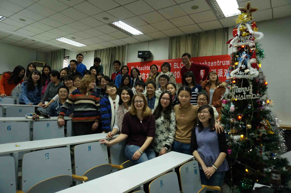 12月22日下午,一场气氛欢快的德语圣诞派对在北京语言大学培训学院外语部主北158教室隆重举行。德语外教Maria、Charlotte、中教佟文斌老师与德语秋季周末班的同学一起烘焙德式饼干、唱歌做游戏、煮制德国热酒等,师生共同庆祝圣诞节。期间佟文斌老师还为大家生动地讲解了德国圣诞习俗。学生们通过学烘焙、饮热酒、唱圣诞歌、做游戏,不仅度过一个欢乐的圣诞节,而且还充分的了解了德国文化。继此次圣诞派对之后,本周23日和25日晚,德语晚班的学生们也将享受到这样集视、听、味觉于一体的圣诞盛宴。